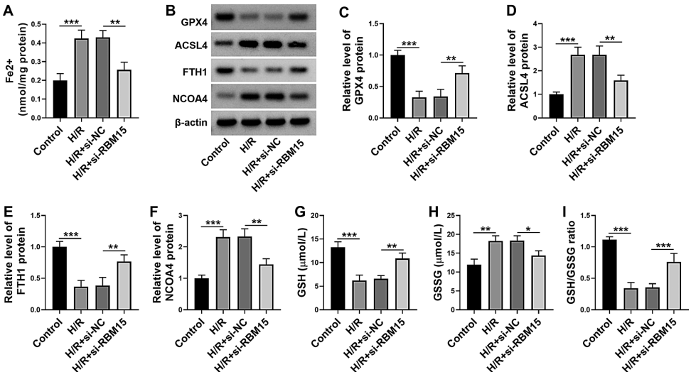 在"Silencing of RBM15 inhibited H/R-induced ferroptosis in AC16 cells"中,研究发现RBM15敲除降低了H/R诱导的铁离子(Fe2+)蓄积,上调了谷胱甘肽过氧化物酶4(GPX4)和铁蛋白重链1(FTH1)表达,同时下调了ACSL4和核受体共激活因子4(NCOA4)水平,改善了氧化型谷胱甘肽(GSSG)/还原型谷胱甘肽(GSH)比值。