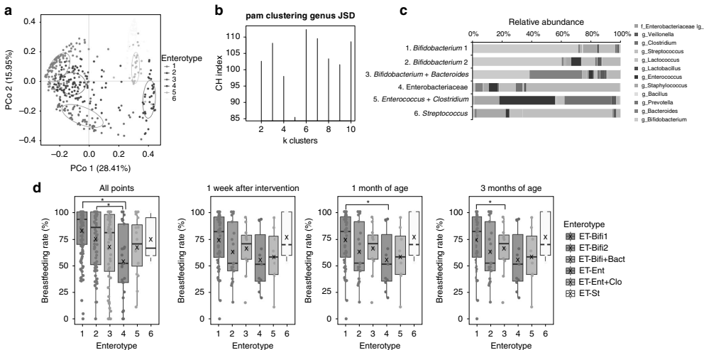 补充B. infantis M-63使双歧杆菌相对丰度显著提升(q<0.05),同时抑制肠杆菌科生长。通过PAM聚类分析鉴定出6种肠型,其中双歧杆菌优势型(ET-Bifi 1/2)与母乳喂养率正相关(p<0.05)。