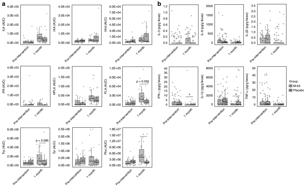 研究人员采用多组学技术开展这项工作:通过16S rRNA测序分析111名婴儿的肠道菌群动态;采用LC-MS/MS检测吲哚类代谢物;结合ELISA和多重免疫分析定量粪便炎症标志物(如calprotectin)和细胞因子(如IL-1β)。所有样本采集时间点覆盖新生儿期至3月龄,并采用严格的随机双盲对照设计。