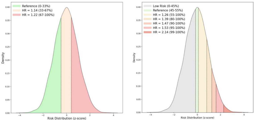 与传统方法对比中,MetaGeno(AUROC 0.809)全面超越PRS(0.650)、LDpred2(0.690)和DeepRisk(0.792)等基线模型。风险分层显示,最高1%人群的IS风险增加2.14倍(95%CI:1.81-2.46),如图3所示。