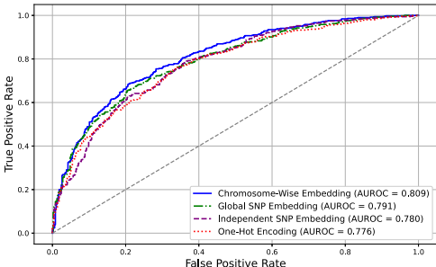 模型选择方面,Transformer以平均AUROC 0.792显著优于其他架构,对IS的预测性能达0.809。如图2所示,染色体嵌入策略(AUROC 0.809)较全局嵌入(0.791)和独热编码(0.776)展现出明显优势。
