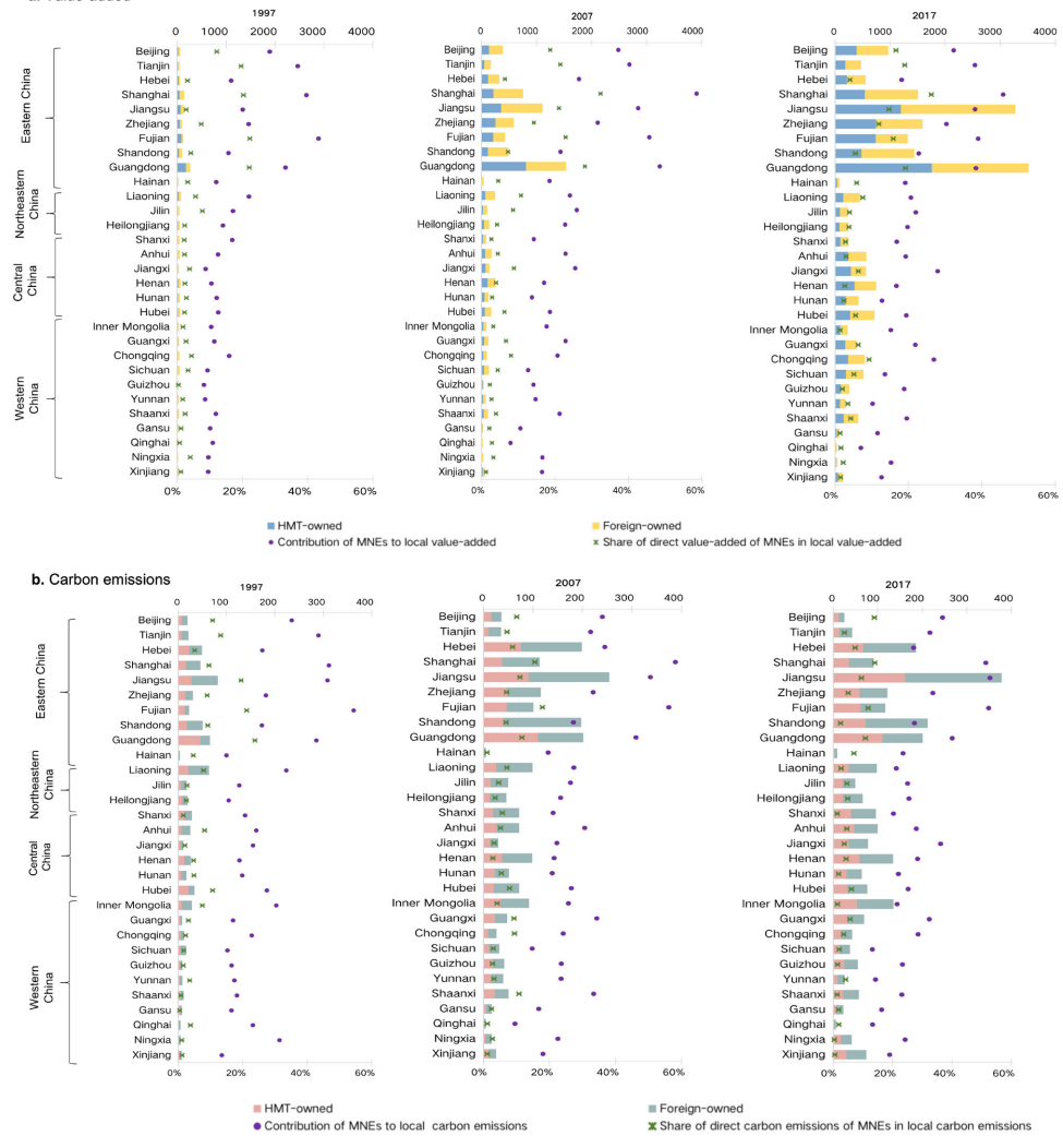 区域不平等演变:东部省份获得70%的MNEs增加值但仅承担50%排放,而西部省份的排放强度是东部的6-10倍。