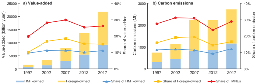 MNEs对增加值和碳排放的贡献:MNEs贡献了全国26.2%的增加值和20-30%的CO2排放,电力燃气水供应业占其碳排放的50%。