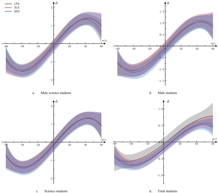 30分钟MVPA替代LPA/睡眠/SED可使理工科男生体质分提高1.104分;60分钟替代可使总体学生提高0.887分。剂量-反应曲线显示,替代效应呈对称非线性关系:总体学生在±50分钟、理工科学生在±45分钟时达到峰值效益。45分钟替代模型中,MVPA替代使50米跑和耐力跑分别提升0.057秒和3.041秒。