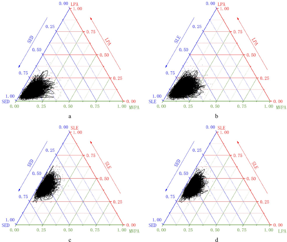 通过变异矩阵分析发现,睡眠与久坐行为的ilr方差最小(ln(SLE/SED)=0.082),表明二者具有高度替代性。而MVPA与其他行为的关联性较弱,需要作为独立成分分析。三元图直观显示,大学生群体中运动行为与睡眠/久坐的相互替代概率较低。