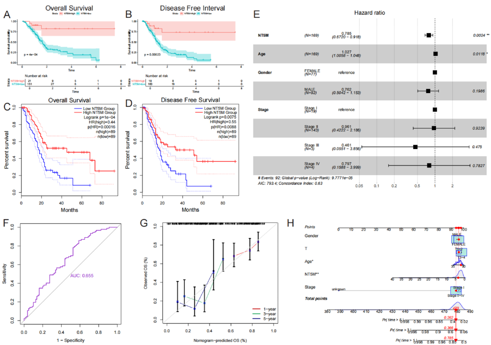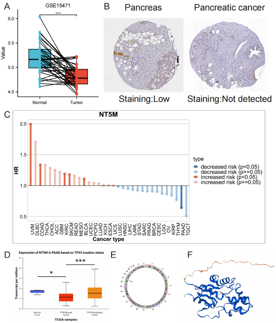通过TCGA-PAAD队列分析,NT5M在癌组织中表达显著低于正常组织(p<0.001)