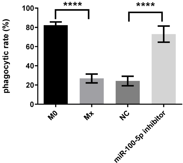 功能实验表明,PC-3外泌体诱导的巨噬细胞(Mx)吞噬能力显著低于未处理巨噬细胞(M0),而抑制miR-100-5p可逆转这一现象。同时,miR-100-5p促进M2型巨噬细胞标志物CD206、IL-10和TGF-β的表达。