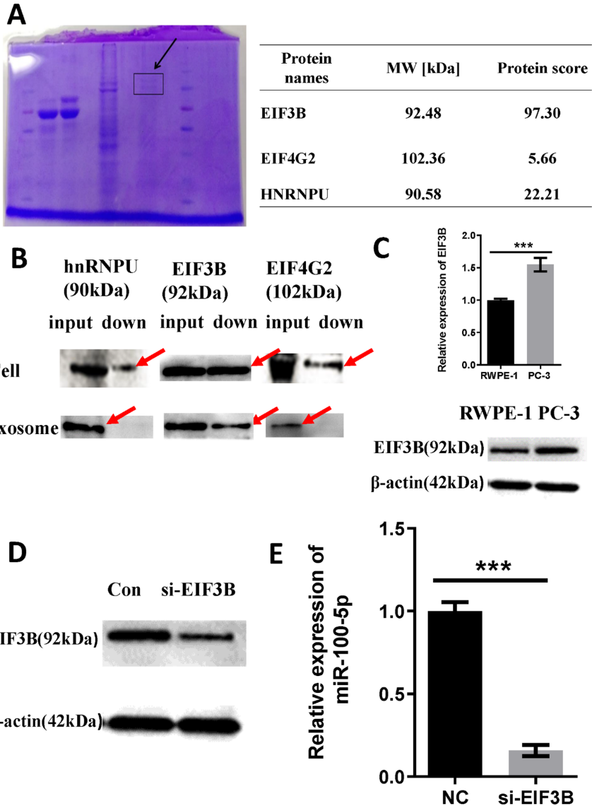 RNA pull-down结合质谱分析发现,EIF3B在PC-3细胞和外泌体中均能与miR-100-5p特异性结合。PC-3细胞中EIF3B表达高于RWPE-1细胞。敲低EIF3B可显著减少PC-3外泌体中miR-100-5p的富集,且来自EIF3B敲低PC-3细胞的外泌体能促进巨噬细胞ROS产生和吞噬活性。