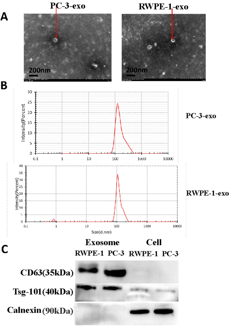 研究人员首先从PC-3(前列腺癌细胞)和RWPE-1(正常前列腺上皮细胞)中分离外泌体,通过TEM观察到典型的杯状凹陷形态,NTA显示粒径为30-150nm,Western blot检测到外泌体标志蛋白CD63和Tsg-101的表达,而非外泌体标志蛋白Calnexin不表达,证实获得了高纯度外泌体。