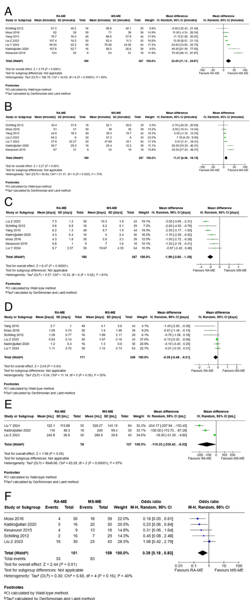 • 手术时间比较:RA-ME组CPB时间显著延长23分钟(95%CI 11.1-35.0,p=0.0001),ACC时间增加11.4分钟(4.6-18.2,p=0.001),反映机器人手术的技术复杂性。