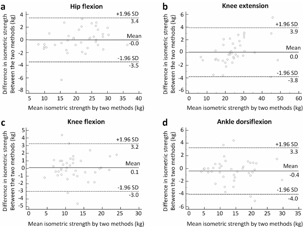 IDLE与金标准HHD在四大关节测试中均呈现高度一致性:
