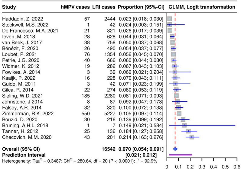 hMPV在老年LRI病例中的合并阳性率为7.0%(95%CI 5.4%-9.1%),但存在显著异质性(I2=94%)。亚组分析显示英国阳性率最高(17.5%),意大利最低(2.8%),而性别差异无统计学意义(P=0.92)。