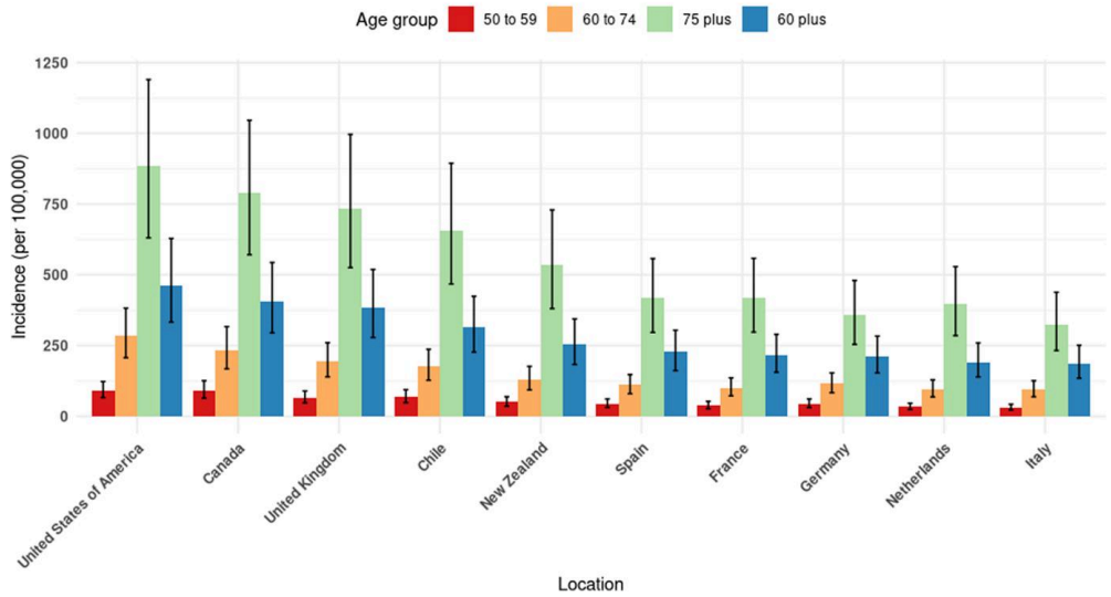 2019年≥60岁人群hMPV发病率呈现显著地域差异:美国最高(462.1/10万),意大利最低(185.7/10万)。年龄分层显示≥75岁群体发病率显著升高,男性负担普遍高于女性。