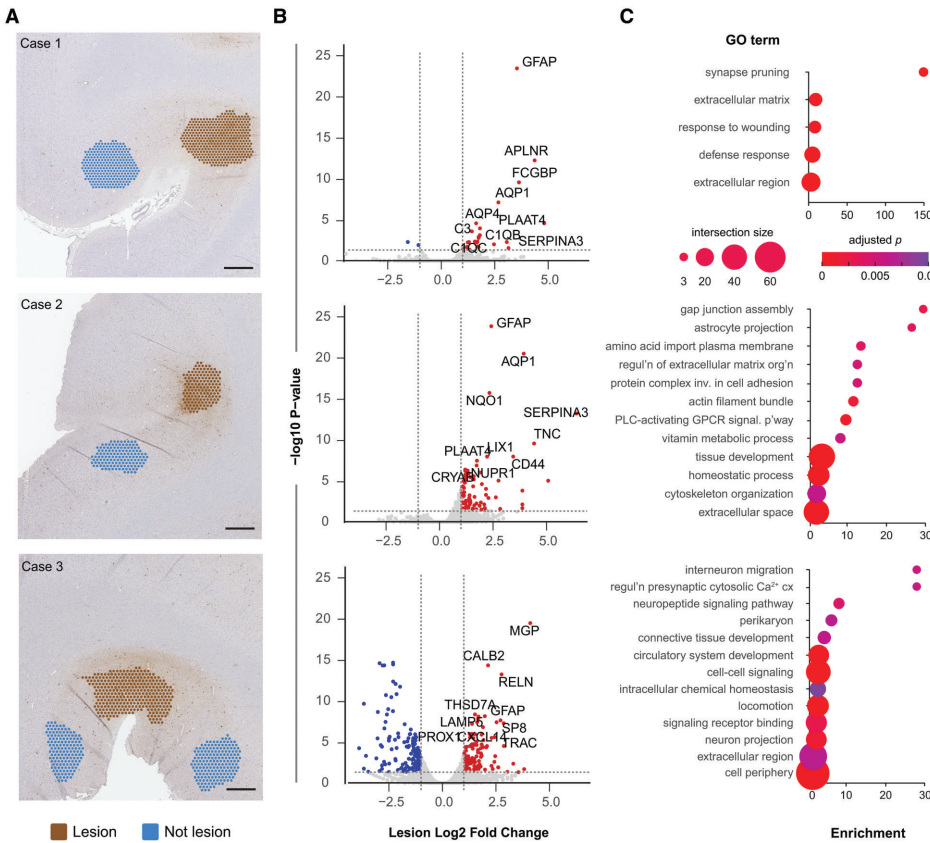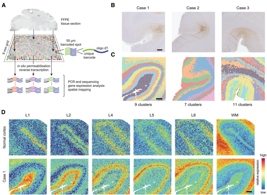 为突破这一困境,悉尼大学(University of Sydney)与皇家阿尔弗雷德医院(Royal Prince Alfred Hospital)的研究团队另辟蹊径,采用Visium空间转录组学技术,首次实现CTE病灶的分子“精准定位”。他们选取4例经尸检确诊的CTE患者脑组织(经伦理审查批准),对包含典型病灶的福尔马林固定石蜡包埋(FFPE)样本进行创新性分析:通过连续切片策略,首尾切片用AT8抗体标记p-tau以精确定位病灶,中间切片则用于空间转录组检测。利用Visium载玻片上55微米分辨率“捕获点”的条形码标记,将mRNA表达数据与病灶空间坐标精准对应,并结合单细胞RNAseq公共数据库进行细胞类型溯源。