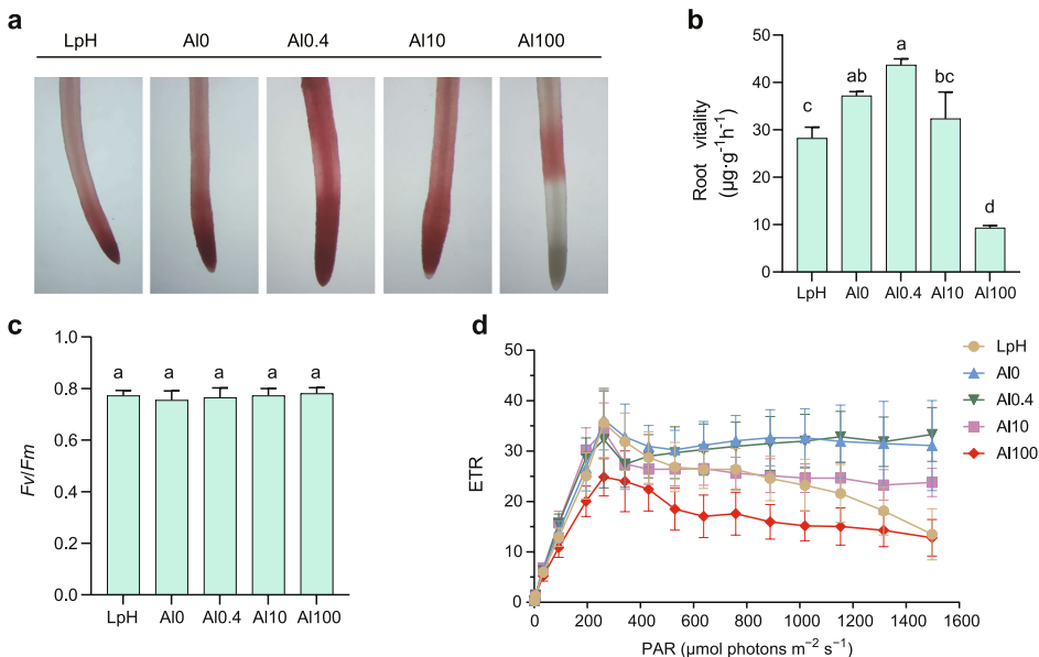华中农业大学的研究团队通过多组学联用技术,首次系统揭示了茶树在0-100 mM铝梯度胁迫下的生理与分子响应网络。研究发现,铝对茶树的影响呈现典型的"低促高抑"双相效应:0.4 mM处理使根系活力提升8.91%,而10 mM和100 mM处理则分别导致活力下降19.31%和76.81%。这种剂量效应在叶片电子传递速率(ETR)中同样得到印证,为茶树铝响应的生理阈值提供了量化依据。