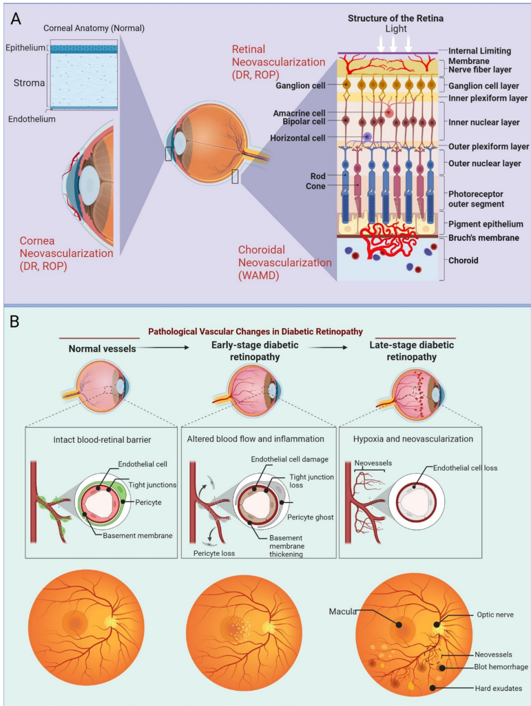 眼部新生血管疾病(ONDs)主要包括角膜新生血管(CoNV)、湿性年龄相关性黄斑变性(wAMD)和糖尿病视网膜病变(DR),是全球视力障碍的主要原因。这些疾病的共同特征是病理性血管生成、炎症和纤维化,其中VEGF/HIF-1α信号轴起核心调控作用。在缺氧条件下,HIF-1α稳定表达并上调VEGF,促进内皮细胞增殖和渗漏性新生血管形成。慢性炎症通过释放TNF-α、IL-6等细胞因子加剧血管损伤,而氧化应激则通过活性氧(ROS)破坏血-视网膜屏障(BRB)完整性。