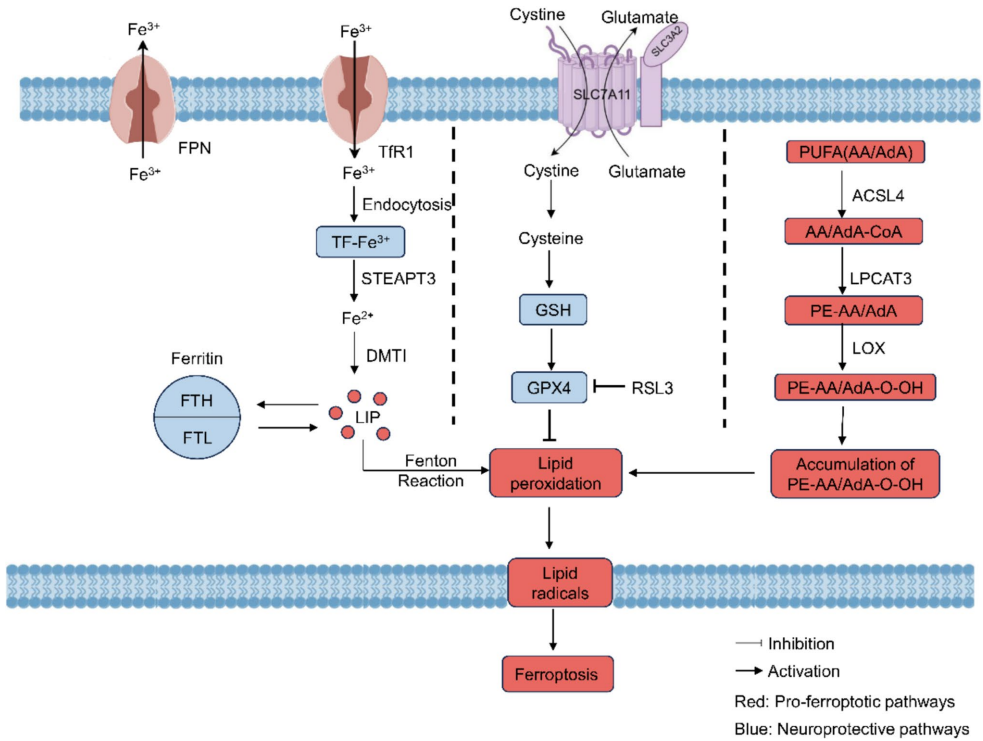 铁死亡是2012年发现的一种铁依赖性程序性细胞死亡形式,其特征是铁过载、谷胱甘肽(GSH)耗竭和脂质过氧化物积累。在缺血性脑卒中中,铁代谢紊乱表现为转铁蛋白受体1(TfR1)和二价金属转运体1(DMT1)上调,而铁转运蛋白(FPN1)下调,导致神经元内游离铁水平异常升高。这些游离铁通过Fenton反应产生大量活性氧(ROS),攻击细胞膜上的多不饱和脂肪酸(PUFAs),在长链脂酰辅酶A合成酶4(ACSL4)和15-脂氧合酶(15-LOX)的催化下形成致命的脂质过氧化物。