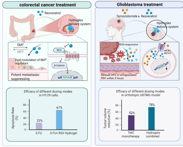 这篇综述系统探讨了白藜芦醇(RSV)与水凝胶递送系统的协同抗肿瘤机制。作者指出RSV通过抑制Wnt/β-catenin、PI3K/Akt等通路发挥多靶点作用,但面临代谢快、生物利用度低(<5%)等挑战。水凝胶凭借pH/温度响应性、自修复等特性,可提升RSV稳定性(包封率≈80%)并实现肿瘤微环境(TME)触发释放,在结直肠癌(抑制β-catenin核转位58%)和胶质母细胞瘤(ROS响应性释放89%)模型中展现显著疗效。