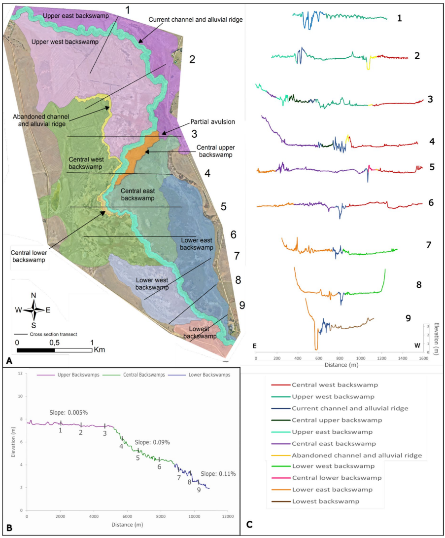 HAND模型将洪泛平原划分为11种宏观地貌单元,包括东西侧回水沼泽(平均相对高程2.26m/1.82m)和中央低洼回水沼泽(最低相对高程1.2m)。决口区下游形成0.15km2的中央上回水沼泽,其平均淹没频率达17.45%。