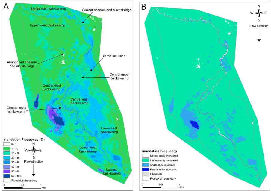 五年监测显示91.64%区域为间歇性淹没(1-25%频率),仅0.33%为永久淹没。中央东回水沼泽平均淹没频率最高(18.28%),而废弃河道区仅9.99%。