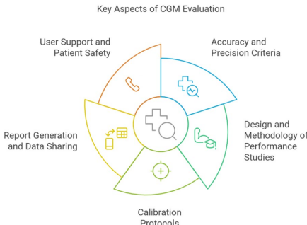 参照IFCC工作组标准,要求性能研究包含≥100名受试者,产生约12,000组配对数据。强调必须公布低血糖(<54 mg/dL)和极高血糖(>180 mg/dL)条件下的准确性数据,且25%数据需采集于血糖快速波动阶段(>2 mg/dL/min)。