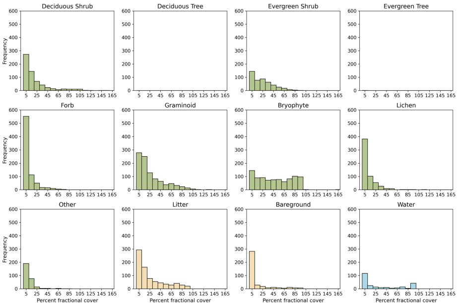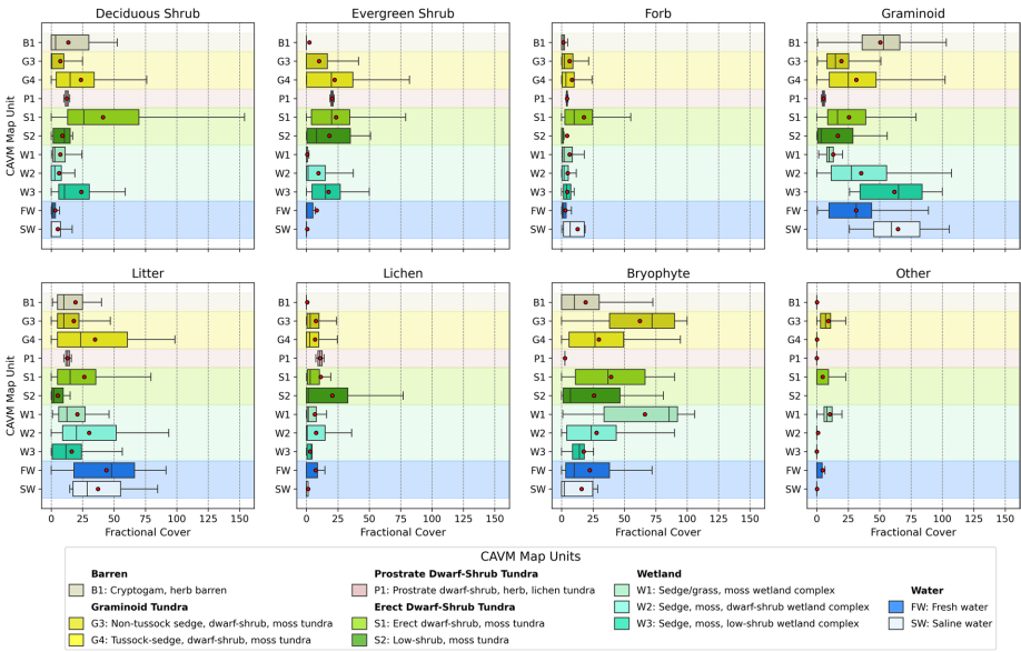 为解决这一挑战,Oak Ridge National Laboratory(美国橡树岭国家实验室)领衔的国际团队开发了Pan-Arctic Vegetation Cover(PAVC)数据库。研究整合了阿拉斯加5大数据库的977个调查单元数据,涵盖644个物种和8类植物功能型(PFT),包括落叶/常绿灌木、苔藓、地衣等。通过标准化物种命名(基于AKVEG Checklist)和开发可复用的Python工作流程,团队建立了首个兼容遥感需求的泛北极植被覆盖数据库。该成果发表于《Scientific Data》,为理解北极植被-气候反馈机制提供了关键基础设施。