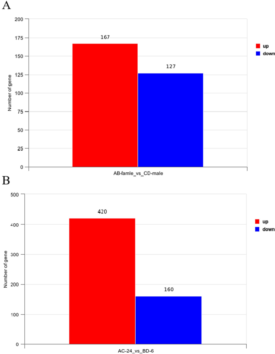 性别比较发现294个DEGs,其中胶原基因COL1A1/COL1A2/COL4A2在雄性中显著上调,与"胶原纤维组织"(GO:0030199)等术语显著相关