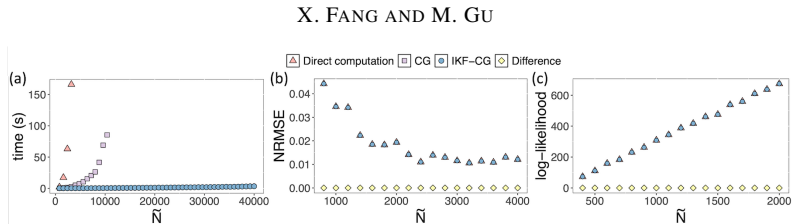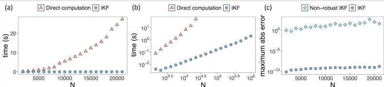 加州大学圣塔芭芭拉分校统计与应用概率系的Xinyi Fang和Mengyang Gu*团队在《Biometrika》发表的研究中,开发了逆卡尔曼滤波(IKF)算法。该算法通过创新性地反向运用卡尔曼滤波原理,实现任意实值向量与DLM协方差矩阵的精确乘法运算,将计算复杂度降至O(q3N)。研究者将IKF与共轭梯度(CG)算法整合,形成IKF-CG方法,成功应用于粒子相互作用函数的非参数估计,为群体行为研究提供了新范式。
