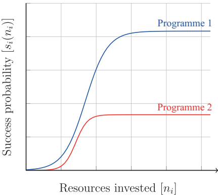 研究采用数学建模方法,构建了预期收益函数ER(n1,n2)=v(s1(n1)+s2(n2)),其中s1和s2分别代表两种方法的成功概率函数。通过分析不同资源分配情境下的预期收益曲线,研究揭示了三个关键发现: