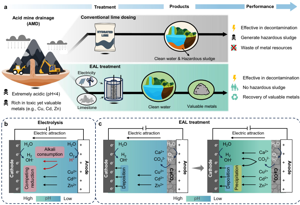 矿山开采在为现代社会提供金属资源的同时,也产生了大量酸性矿山废水(Acid Mine Drainage, AMD)。这种富含硫酸和重金属(如Cu、Cd、Zn)的废水,不仅造成河流污染和土壤退化,还浪费了可回收的战略金属资源。传统石灰中和法虽能快速提升pH值,但会产生含重金属的危险污泥,且难以分离有价值的金属。更棘手的是,现有电化学技术因需消耗大量能量中和酸性环境,实际应用受限。如何实现AMD治理与资源回收的双赢,成为环境工程领域的重大挑战。
