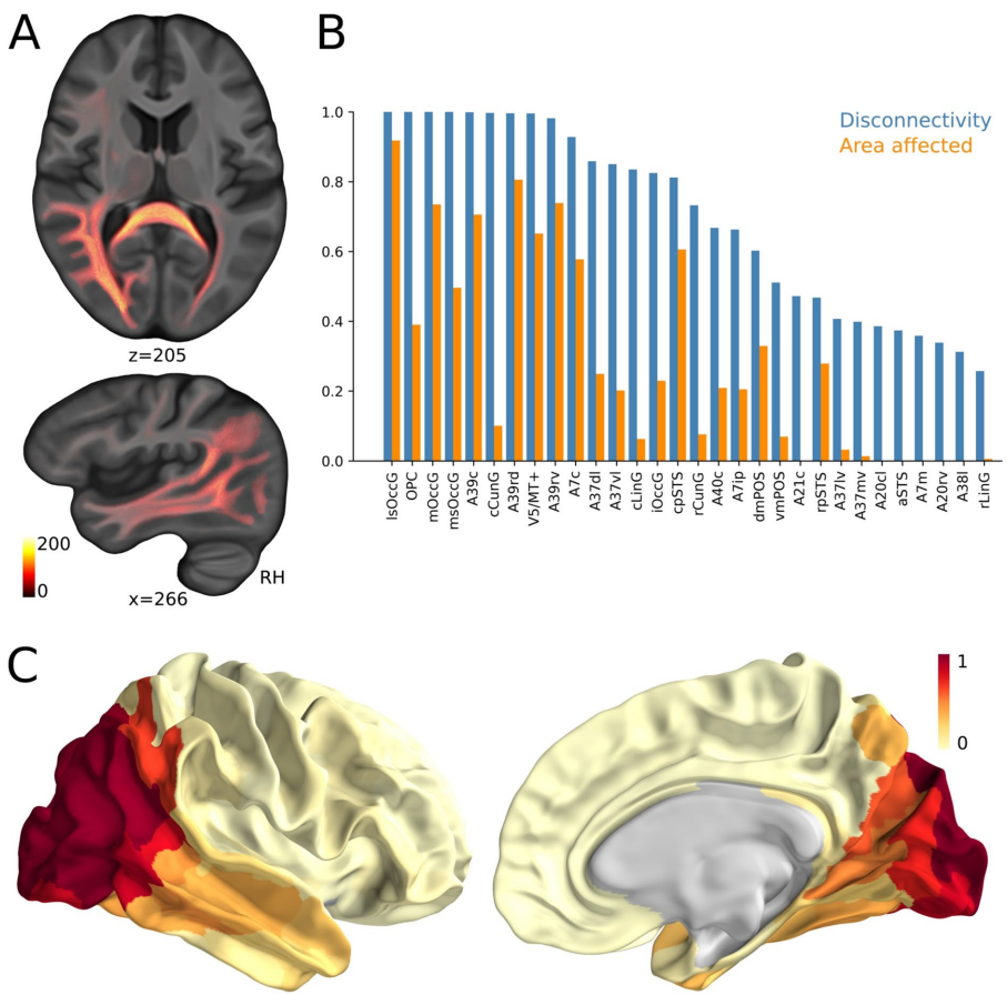 连接组学分析揭示了超越病灶范围的广泛断开:右侧顶叶上回(Area 7)、颞上回(STG)、视觉运动区V5/MT、角回(Area 39,40)均受影响,尤其值得注意的是胼胝体压部(splenium)的严重断开。这种断开模式导致视觉信息半球间整合障碍,解释了患者无法将衬衫袖领整合为完整形象的临床表现。