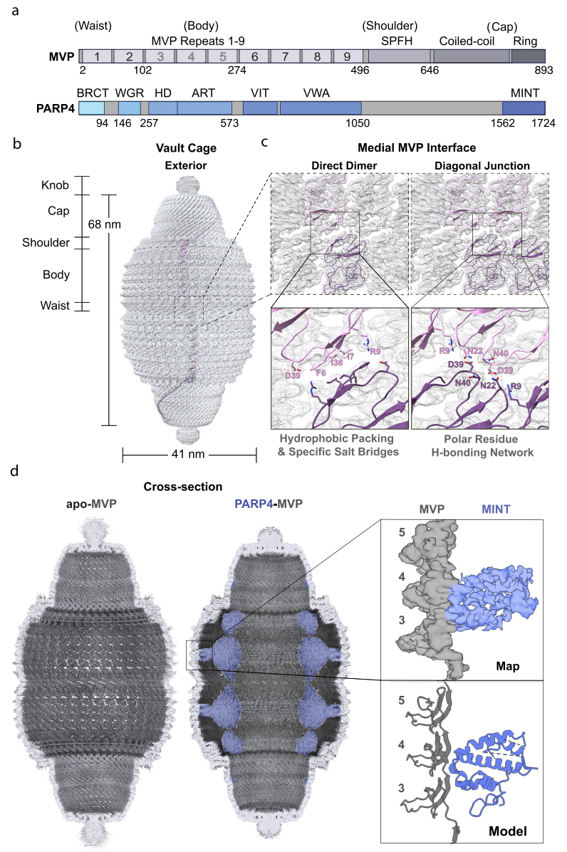 在真核细胞中存在一种神秘的巨型复合物——穹窿体(vault),其形似中世纪教堂的拱顶结构,由78个主要穹窿体蛋白(MVP)单体组装成椭圆形的纳米笼结构。尽管发现已逾三十年,这个"细胞中的诺亚方舟"如何选择运输的"货物"分子、如何响应外界信号等问题始终未解。尤其令人困惑的是,脊椎动物穹窿体中唯一具有酶活性的次要组分PARP4(多聚ADP核糖聚合酶4),如何与MVP结合并发挥功能一直是领域内的未解之谜。