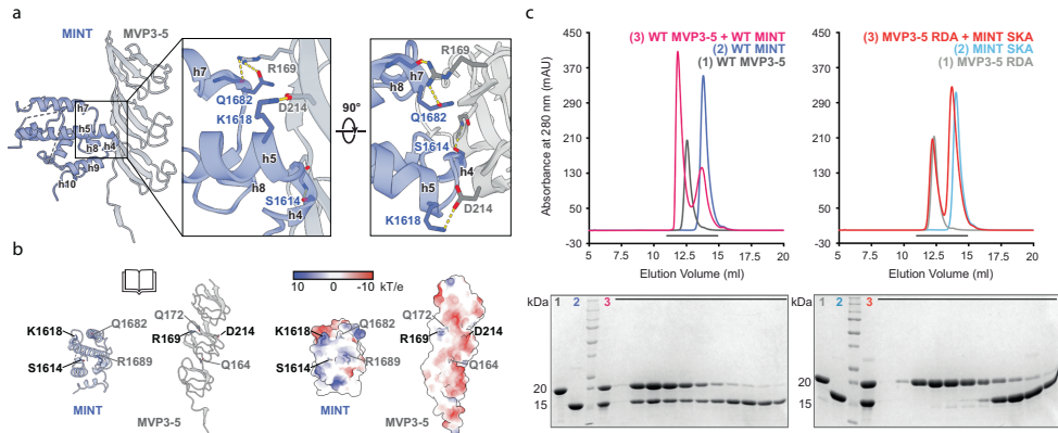 冷冻电镜结构显示,PARP4的MINT结构域像"锚"一样固定在穹窿体腰部,其螺旋h4-h5与MVP3-5结构域形成电荷互补界面。关键残基突变实验证实,PARP4的S1614、K1618与MVP的R169、D214构成氢键网络,破坏这些相互作用会导致复合物解离。