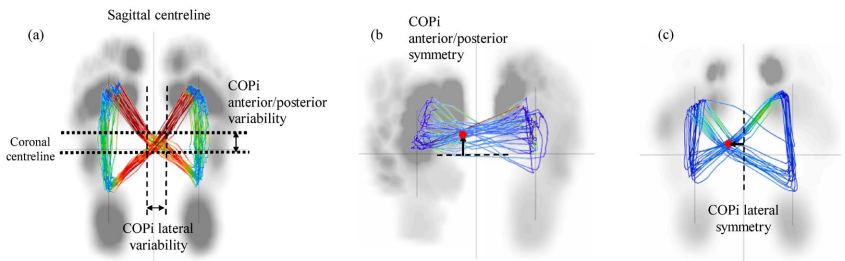 研究团队主要采用了三项关键技术方法:(1)使用FDM-T跑步机系统以120Hz采样率连续记录步态COP参数,克服传统测力台空间限制;(2)通过"蝴蝶图"分析COP轨迹交点(COPi)的对称性和变异性;(3)将患者分为跌倒组(23例)和非跌倒组(28例)进行对比分析。所有患者均来自拟接受单侧关节置换术的终末期OA人群。
