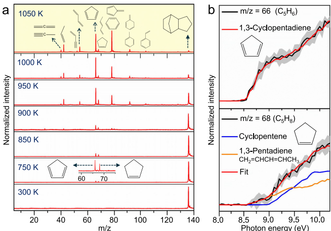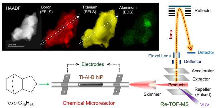 美国海军研究实验室(United States Office of Naval Research)领衔的研究团队另辟蹊径,通过声化学法合成了原子级分散的钛铝硼(TiAlB)纳米粉末催化剂。该材料在《Nature Communications》发表的研究中展现出惊人性能:将模型化合物exo-四氢二环戊二烯(exo-C10H16)的分解温度从1200K大幅降至750K,且选择性生成高附加值的1,3-环戊二烯(c-C5H6)和环戊烯(c-C5H8)。研究人员采用同步辐射真空紫外光电离反射式飞行时间质谱(Re-TOF-MS)实时监测反应产物,结合密度泛函理论(DFT)计算,首次阐明了Ti-B-Al三元的协同催化机制。