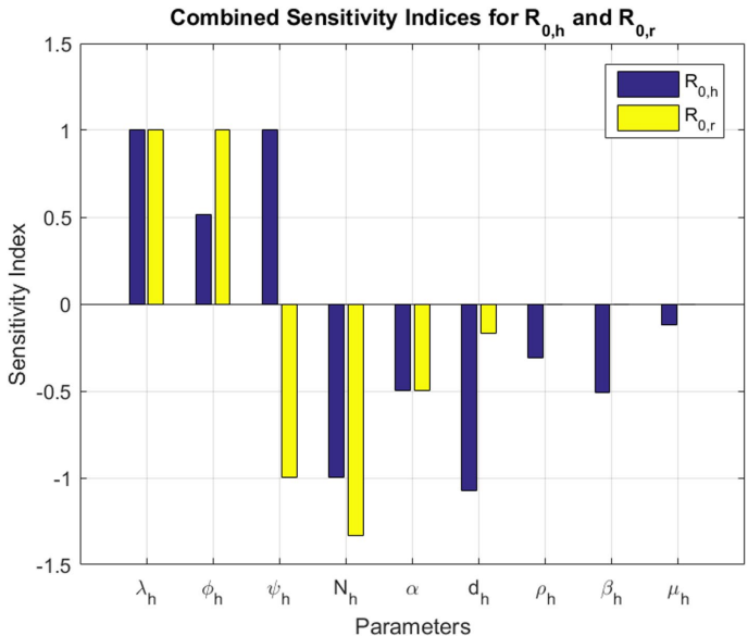 通过对比经典整数阶与分数阶模型,发现α=0.85时分数阶系统更准确反映实际疫情曲线(MAE=4.5373)。参数敏感性分析显示人传人接触率λh(+1.0)与啮齿类出生率Ψr(+1.0)对R0影响最大,而疫苗接种率αh(-0.1786)具有显著抑制作用。