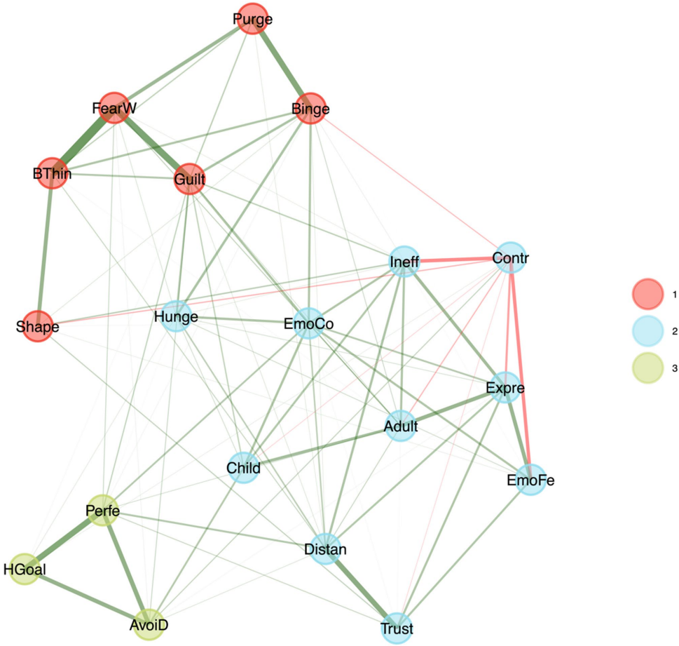 网络维度划分方面,EGA分析将19个关键项目划分为三个独特维度:"ED特异性"维度包含6个与进食行为直接相关的项目;"非特异性"维度包含10个广泛性心理特征项目;出人意料的是,"完美主义"维度独立成簇,包含3个项目。这种划分突破了传统EDI量表的二维框架,提示完美主义在中国ED患者中可能具有独特病理机制。