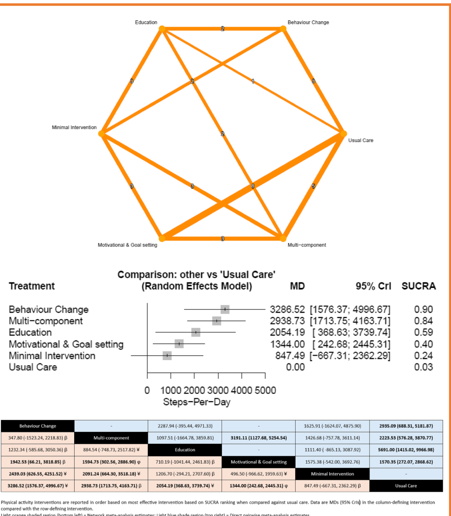 为解答这些问题,英国曼彻斯特大学(University of Manchester)健康科学学院人口健康学部的研究团队Alexander Hodkinson等人在《BMC Medicine》发表了一项开创性研究。通过系统评价和网状Meta分析62项随机对照试验(8952名参与者),首次采用时间进程模型评估四种PA干预设计(教育、行为改变、动机/目标设定和多组分)对心脏代谢疾病患者的影响。研究创新性地结合个体参与者数据(IPD)和贝叶斯网状Meta分析方法,为临床决策提供了高等级证据。