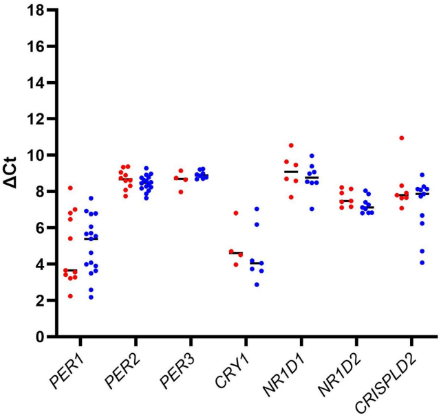 本研究针对个体生物钟类型(chronotype)差异是否影响早晨7点时钟基因表达这一科学问题,通过ChroNu营养试验队列,采用RT-qPCR技术检测CD14+单核细胞中PER1/2/3、NR1D1/2等7个核心时钟基因表达水平。结果发现早晚型个体在此时点的基因表达无显著差异(p>0.07),提示单时间点检测可能不足以揭示生物钟差异,为后续多时间点采样研究提供了重要参考。