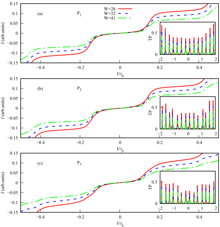 能带结构分析显示P1构象的HOMO-LUMO能隙最大(0.044 eV),P2/P3为0.04 eV。图3数据表明电极宽度增加会降低TP峰值,W=41时电流幅值较W=26下降约40%,这是由于pz轨道在宽电极中产生更多横向输运通道。图4揭示构象差异导致显著电流变化:P3电流比P2高15%,得益于其优化的氢键空间分布。