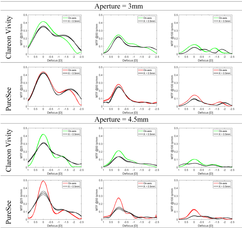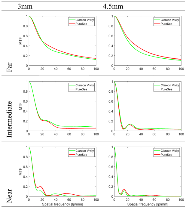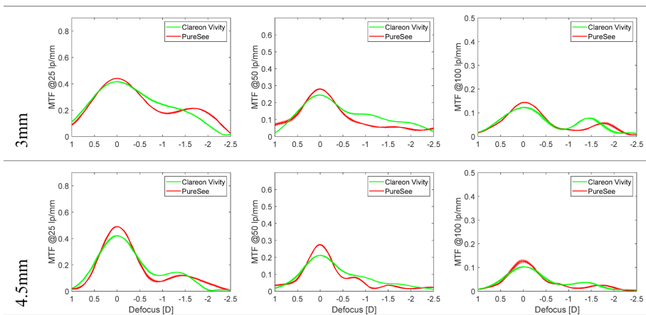 研究采用ISO 11979-2标准的光学测试平台,通过调制传递函数(MTF)分析、USAF分辨率测试、离焦曲线测量等方法,在3.0/4.5mm两种孔径下评估了IOL的成像质量。特别模拟了0.5mm偏心与5°倾斜的临床常见错位情况,并通过点扩散函数(PSF)分析光晕效应。所有测试均使用+20D镜片样本,采用三重复测量取平均值。