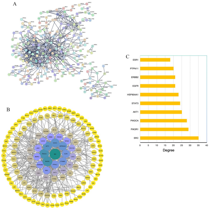 PPI网络显示AKT1、SRC和HSP90AA1处于网络核心位置,degree值分别为25、35和23。这些靶点在肿瘤信号转导中发挥关键作用。