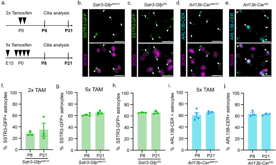 关键技术方法包括:1)采用CMV-Cre构建组成型表达报告基因的Sstr3-GfpON和Arl13b-CerON对照小鼠;2)设计2次(2x TAM)和5次(5x TAM)两种诱导方案,分别从出生后和胚胎期启动标记;3)通过免疫荧光共定位SOX9(星形胶质细胞核标记)与纤毛报告蛋白,定量分析P8(出生后8天)和P21(出生后21天)的纤毛阳性细胞比例。