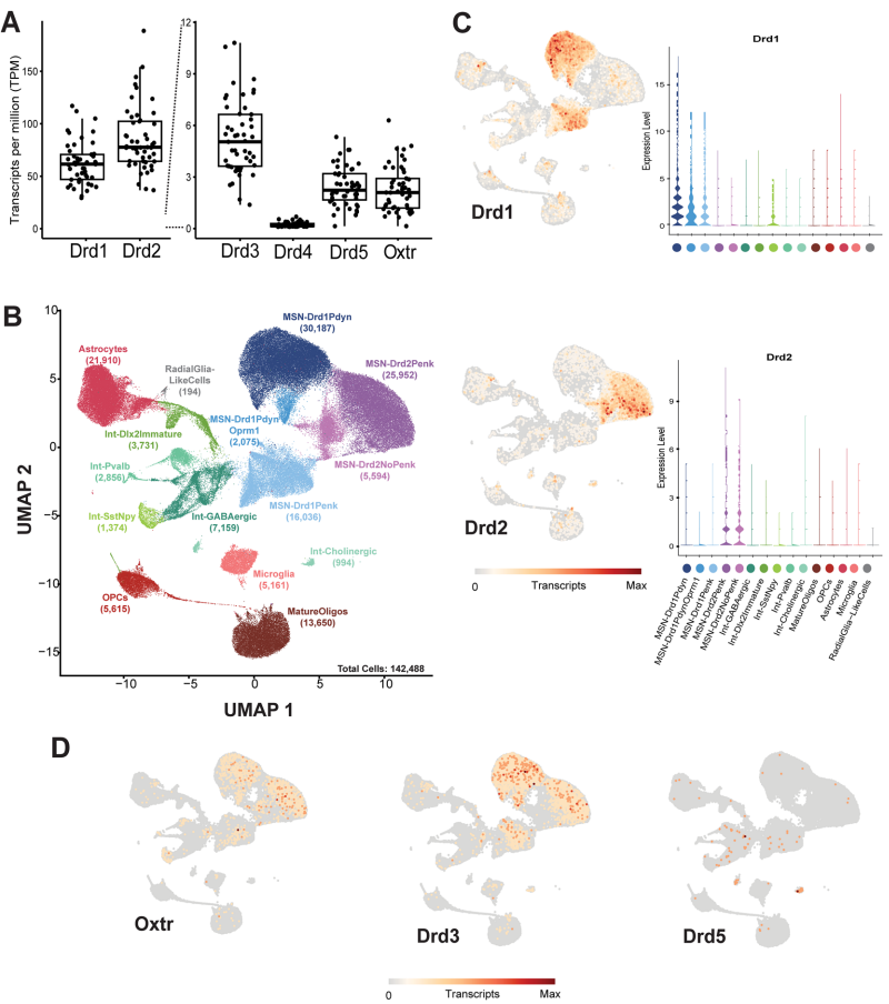 通过整合snRNA-seq数据,研究首次系统描绘了草原田鼠NAc中Oxtr和Drd1-5的细胞类型分布。尽管低丰度转录本(如Oxtr、Drd3、Drd5)存在dropout效应,数据仍显示Drd1和Drd2主要富集于中型多棘神经元(MSNs),而Oxtr可能在MSNs和Sst-Npy中间神经元中表达。Drd5在GABA能和胆碱能中间神经元中的选择性富集,为探索多巴胺受体亚型在社会行为中的特异性作用提供了新线索。