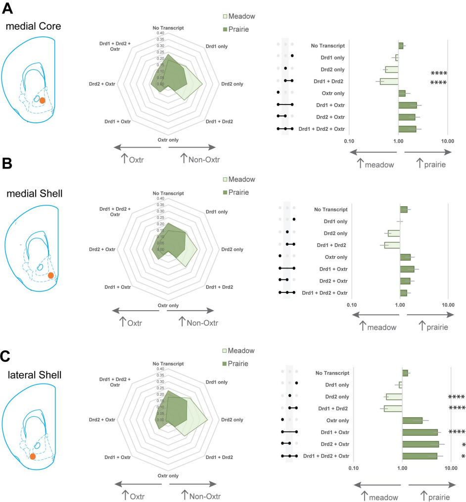 先前研究表明,这两种田鼠在伏隔核(Nucleus accumbens, NAc)区域的催产素受体(OXTR)和多巴胺受体(DRD1/DRD2)表达存在显著差异,但对其细胞水平的分布特征及共表达模式仍知之甚少。NAc作为奖赏系统的关键枢纽,其神经元亚群对Oxt和DA信号的整合可能决定了社会行为的物种特异性。为解决这一科学问题,科罗拉多大学博尔德分校(University of Colorado Boulder)的研究团队在《Scientific Reports》上发表了一项开创性研究。