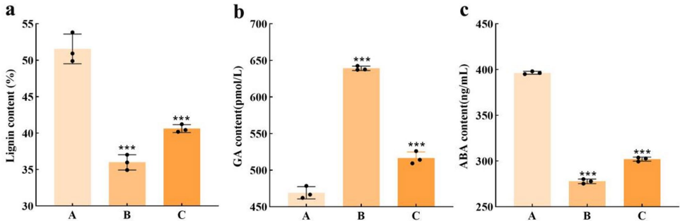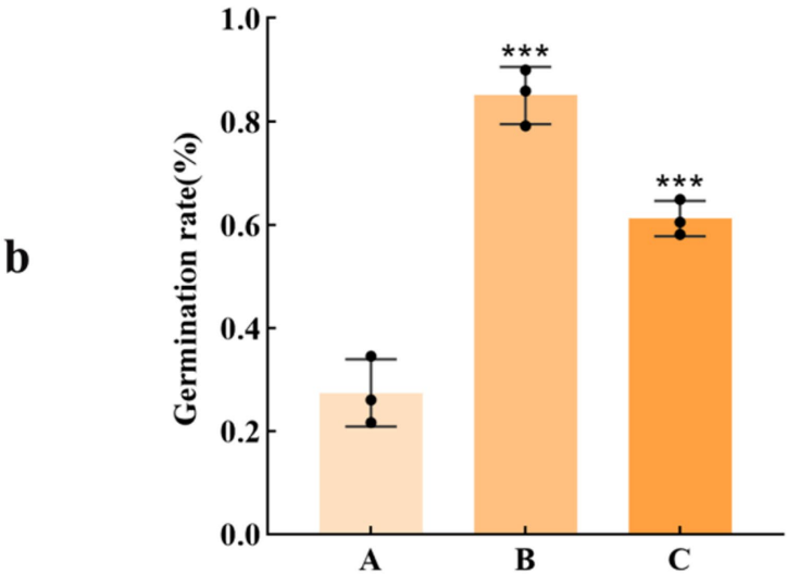 中国三峡大学天然产物研究与开发湖北省重点实验室的研究团队另辟蹊径,从传统萌发菌中提取的Trametenolic acid(TA)找到了突破口。他们发现这种三萜类化合物能打破天麻种子的休眠状态,使原本不能萌发的天麻-蜜环菌共生体系萌发率飙升至85.01%,相关研究成果发表在《Scientific Reports》上。研究人员采用转录组测序(RNA-seq)技术,对比分析了非共生萌发组(A)、TA高剂量处理共生组(B)和低剂量组(C)的基因表达谱,结合qRT-PCR验证和生理指标测定,揭示了TA促进萌发的分子机制。
