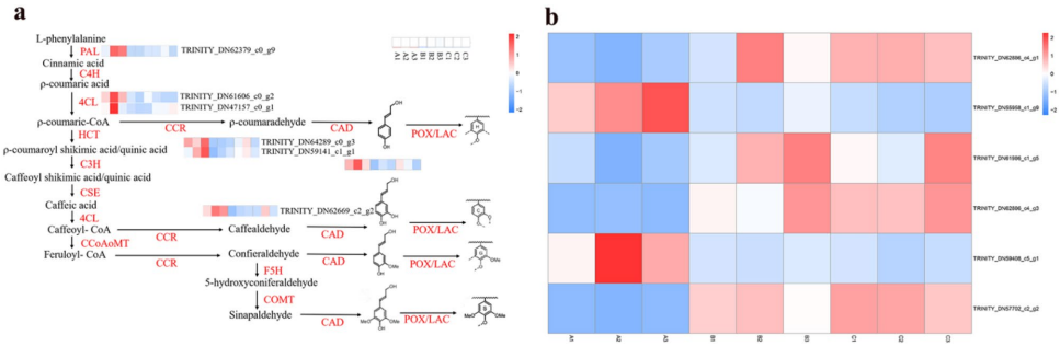 关键技术包括:采用Illumina Novaseq6000平台进行PE150测序,DESeq2软件筛选差异表达基因(DEGs);通过GO和KEGG数据库进行功能注释与富集分析;使用ELISA试剂盒测定GA、ABA和木质素含量;以β-actin为内参进行qRT-PCR验证关键基因表达。实验所用天麻种子采自湖北五峰牛庄高山生态药材基地。