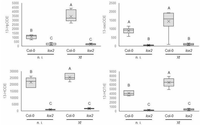 意大利罗马大学和农业研究与农业经济委员会的研究团队将目光投向拟南芥中的AtLOX2基因,这个编码13-脂氧合酶(13-LOX)的基因是植物"脂质武器库"的关键成员。通过比较野生型(Col-0)和lox2突变体对Xf亚种fastidiosa Temecula1的响应,研究人员揭开了13-氧脂素在植物-病原互作中的神秘面纱。
