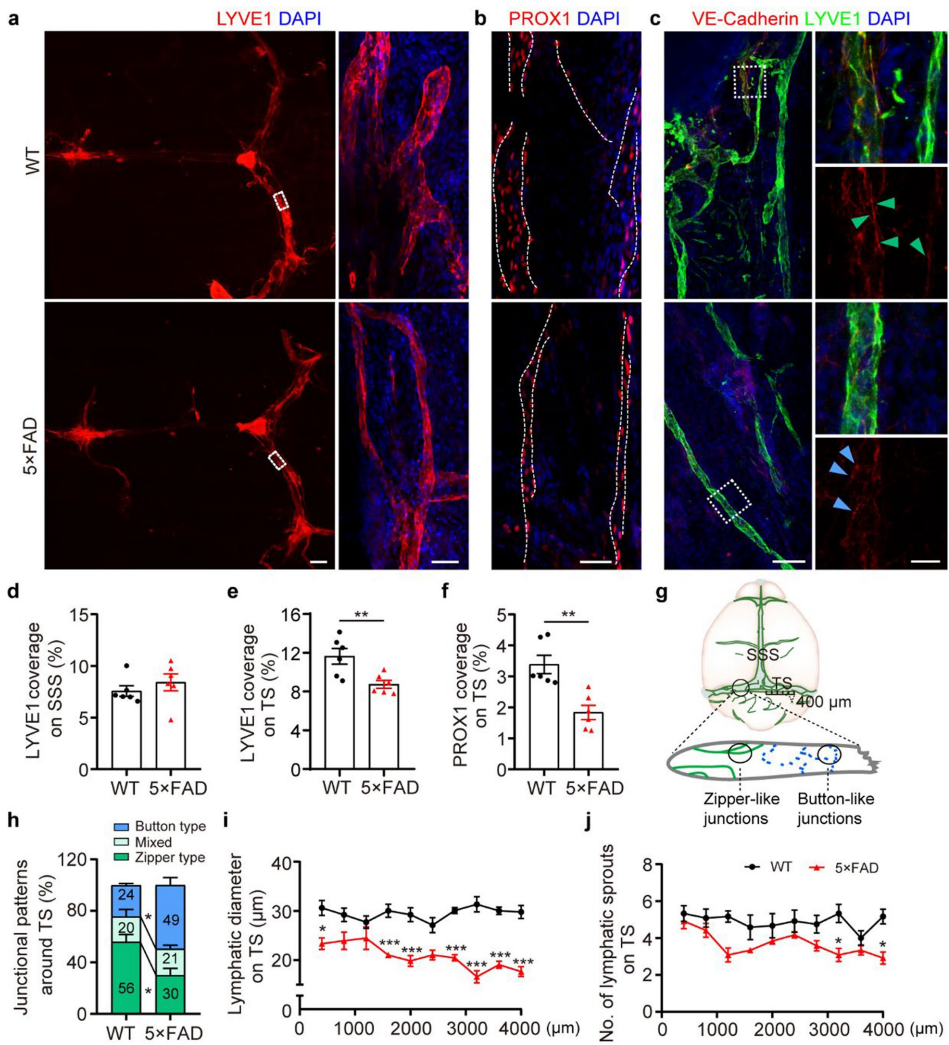 研究发现5xFAD小鼠的脑膜淋巴管覆盖面积减少33%,淋巴管内皮细胞间的"拉链样连接"(zipper-like junction)减少而"纽扣样连接"(button-like junction)增加,这种结构变化直接影响了淋巴引流效率。
