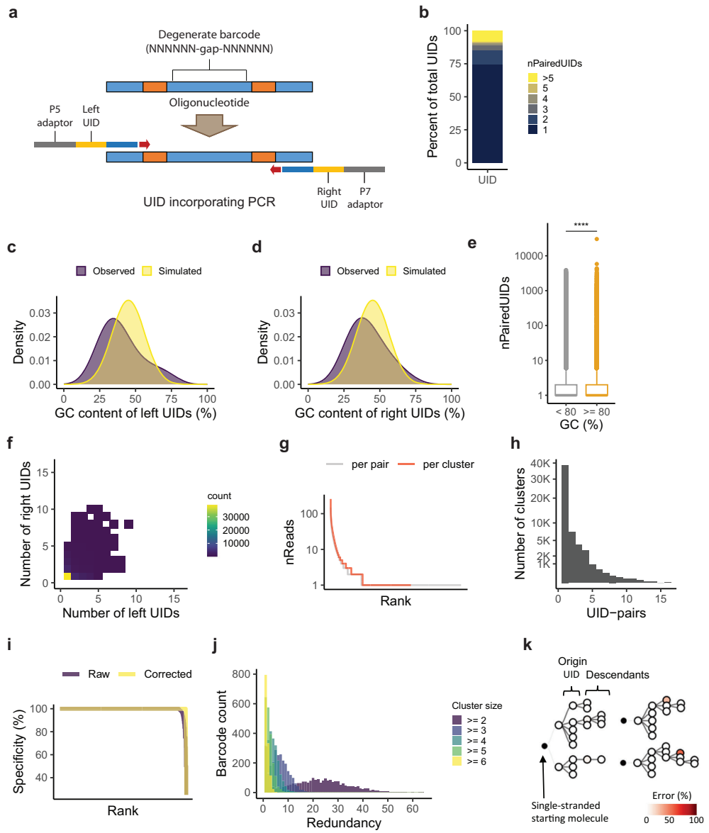 模型实验使用含12nt随机条形码的寡核苷酸,发现高GC含量(≥80%)的UID易导致异常配对。通过过滤这类UID并校正1-2个碱基错配,99.09%的集群实现100%条形码一致性。